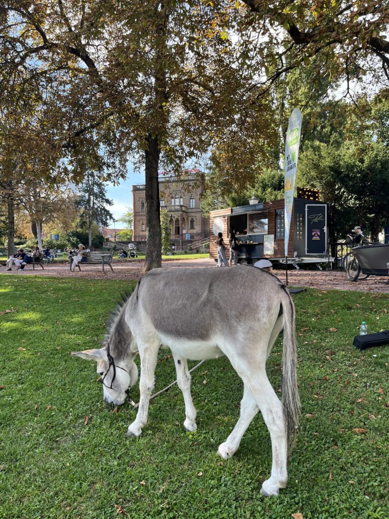 Ein besonderer Moment war der Besuch von Therapie-Esel Charly, der von seinem Einsatz in der Kinderklinik des Universitätsklinikums Freiburg eine Pause einlegte und sich sichtlich am saftigen, grünen und sauberen Gras im Park erfreute.